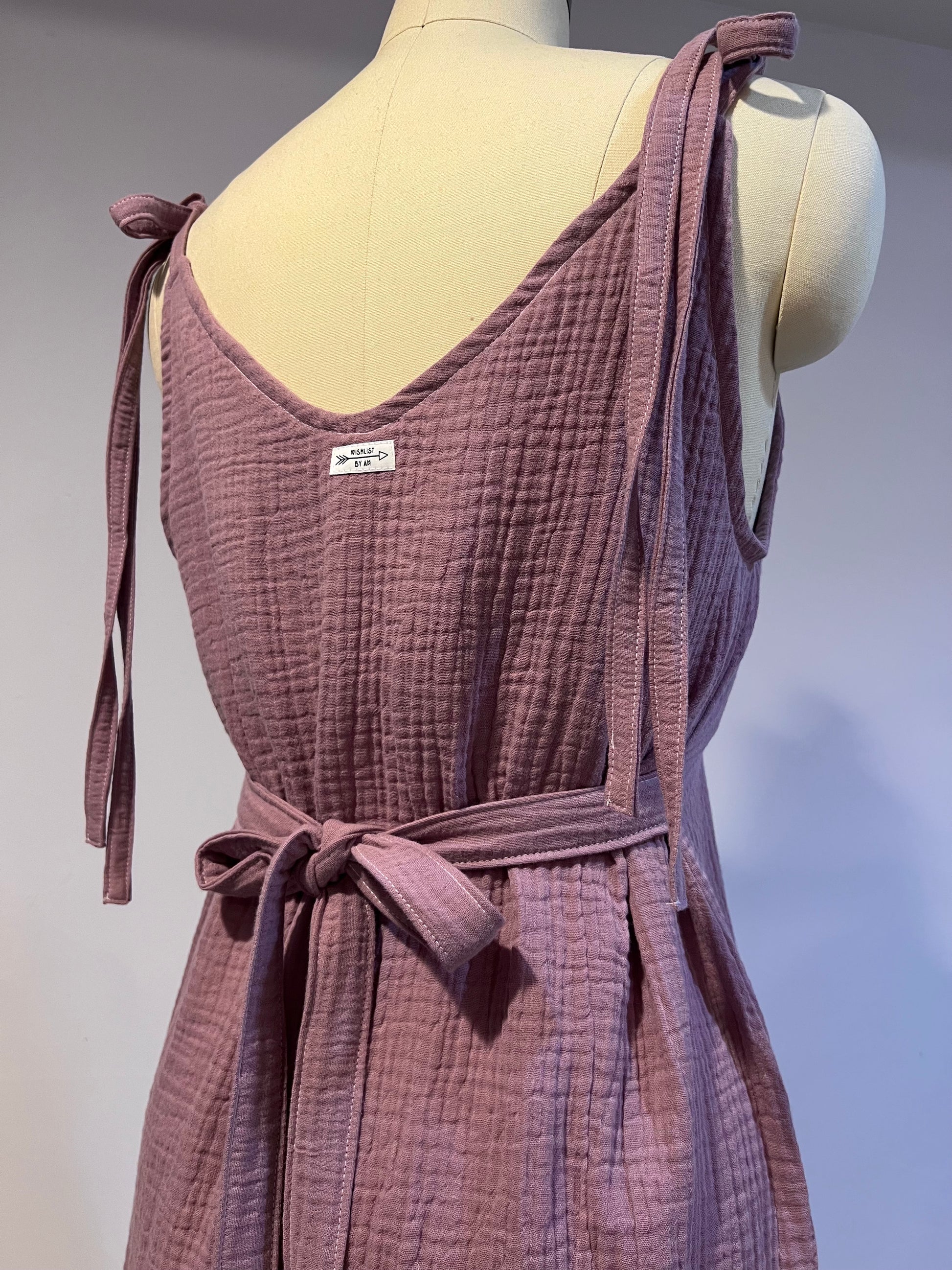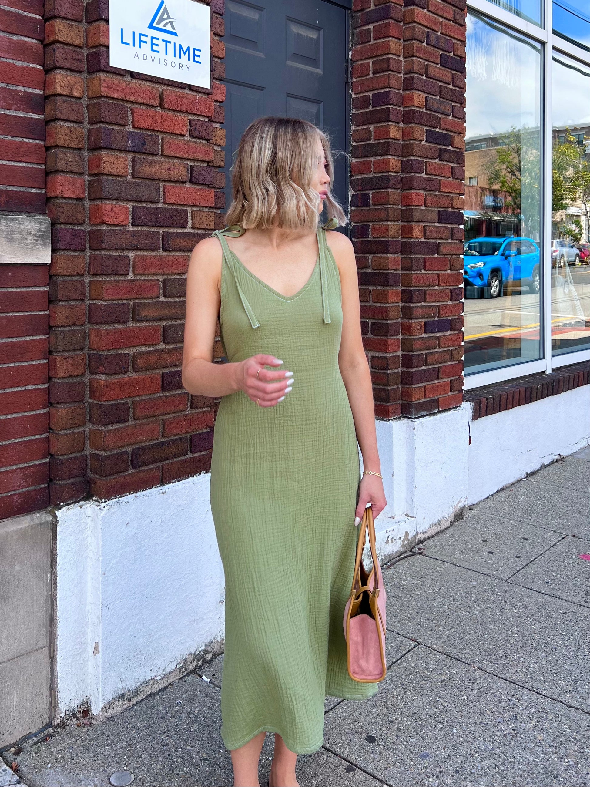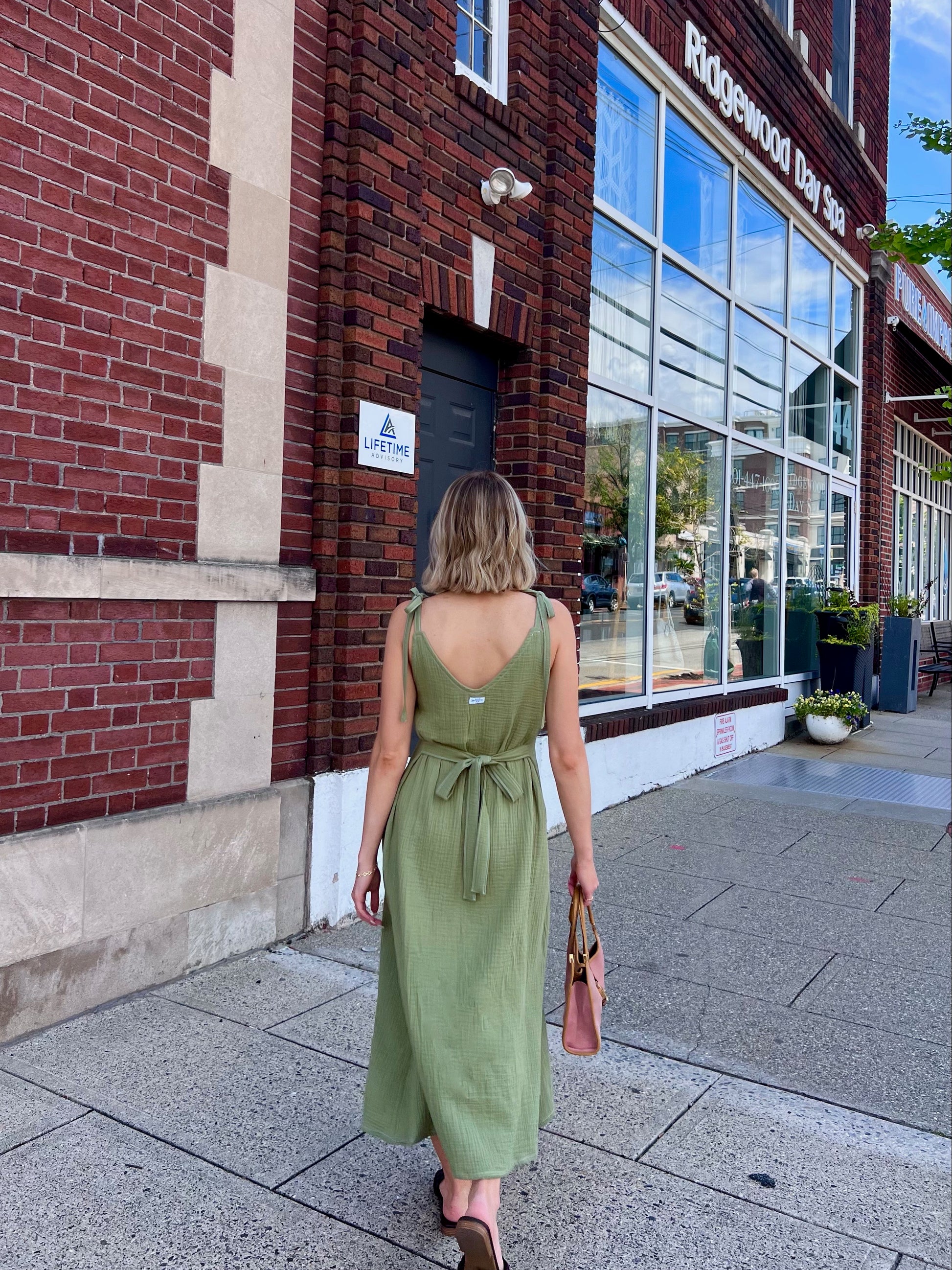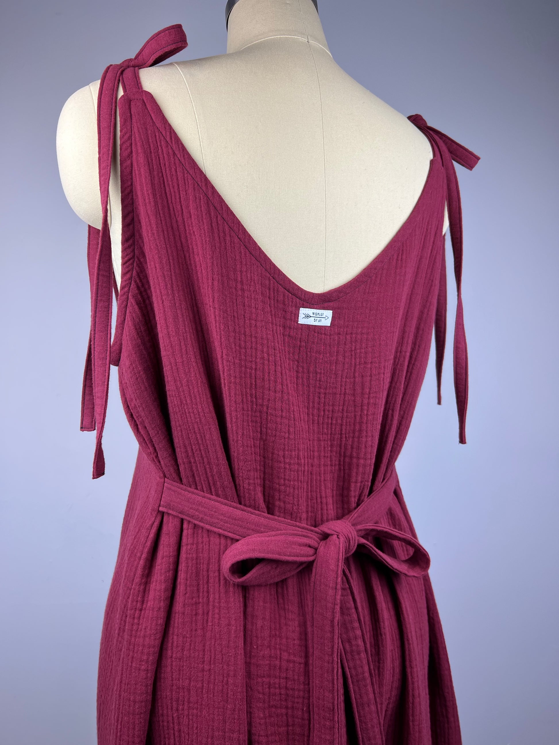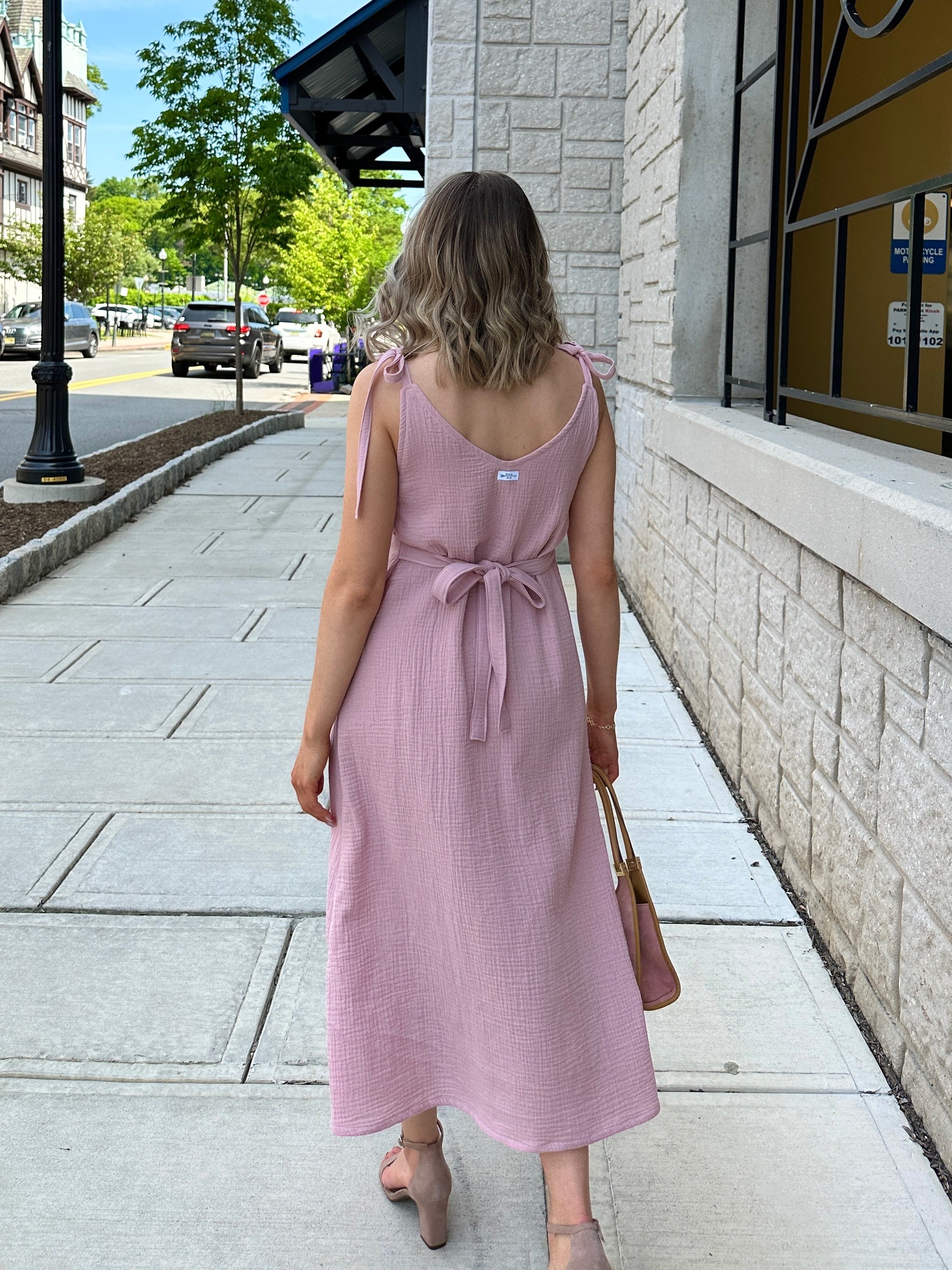 This stunning maxi is made from a 100% cotton gauze material. Making this dress comfortable, light weight, and breathable. Each dress is made from a different solid color with a subtle texture. This a-line silhouette features two ties sewn into the side seams for that perfect built in belt. Tie around the front or back for an extremely flattering fit. The straps are little ties giving you the ability to adjust the straps. This will ensure the waist ties hit you at the smallest part of your waist.