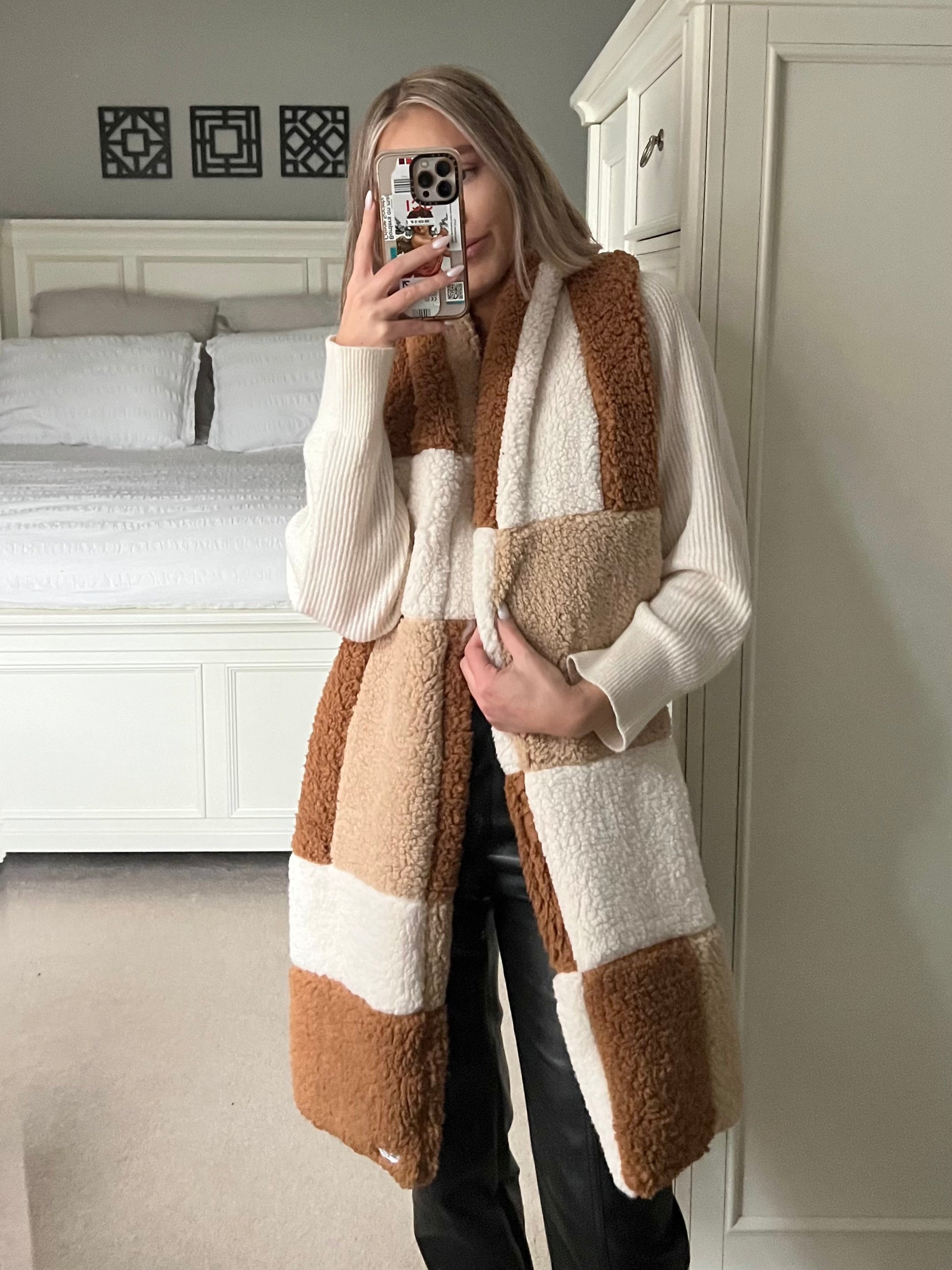 These scarves are patch-worked from the softest sherpa material. Each scarf is made up of a different color palette and no two are the same due to the nature of patch-working. These scarves will keep you warm all winter long, wether you're tailgating at a football game, waiting at the bus stop, walking around town. The uses are endless. Scarves are one size at about 82" in length.