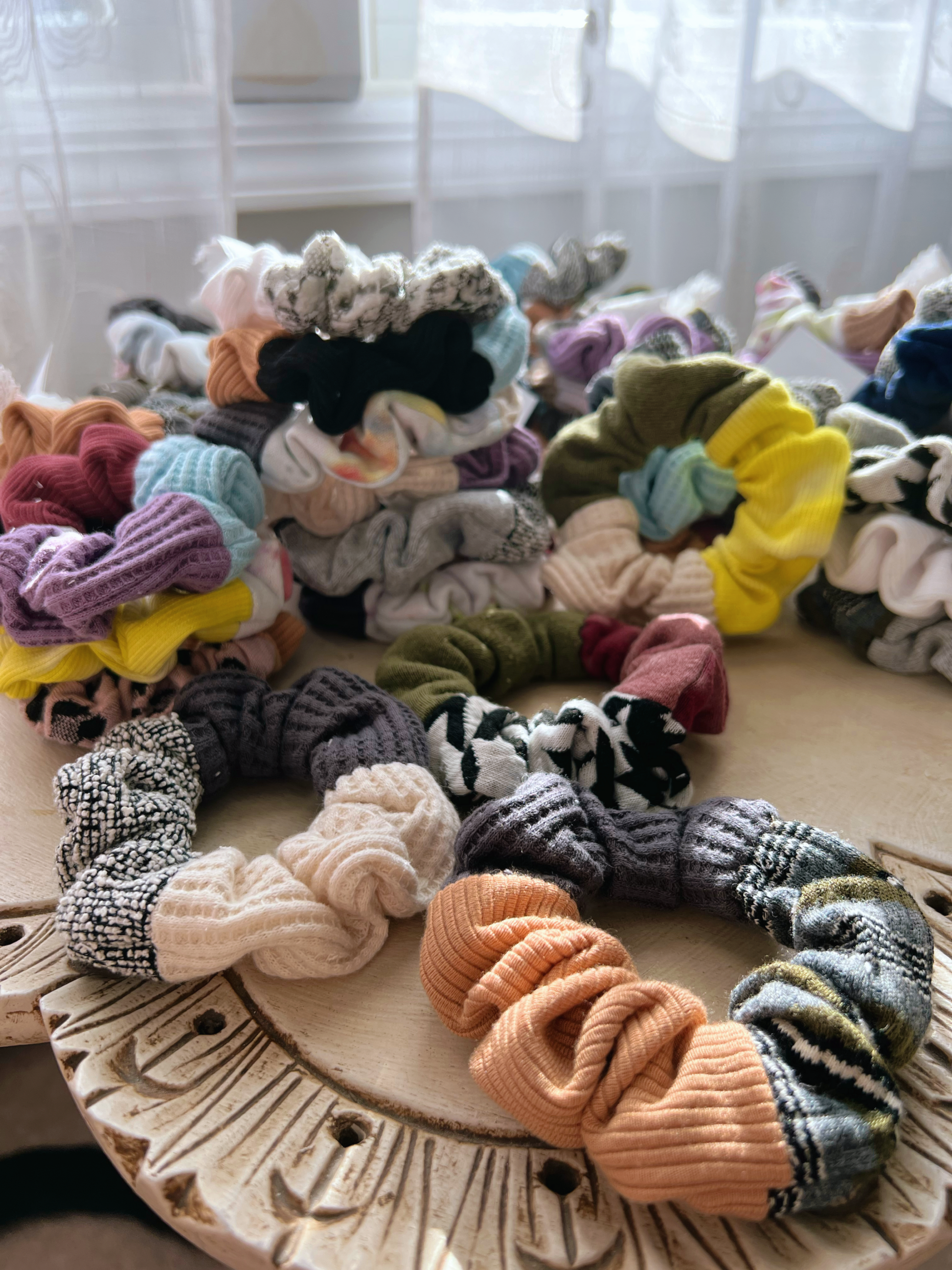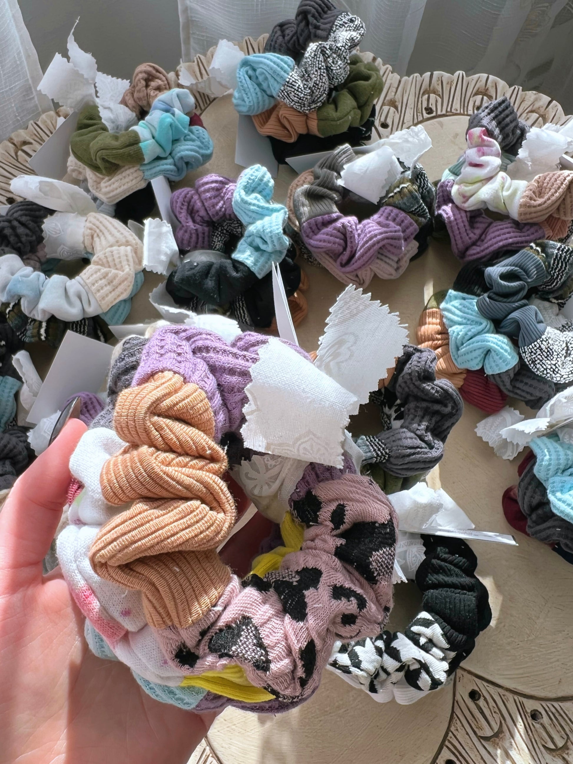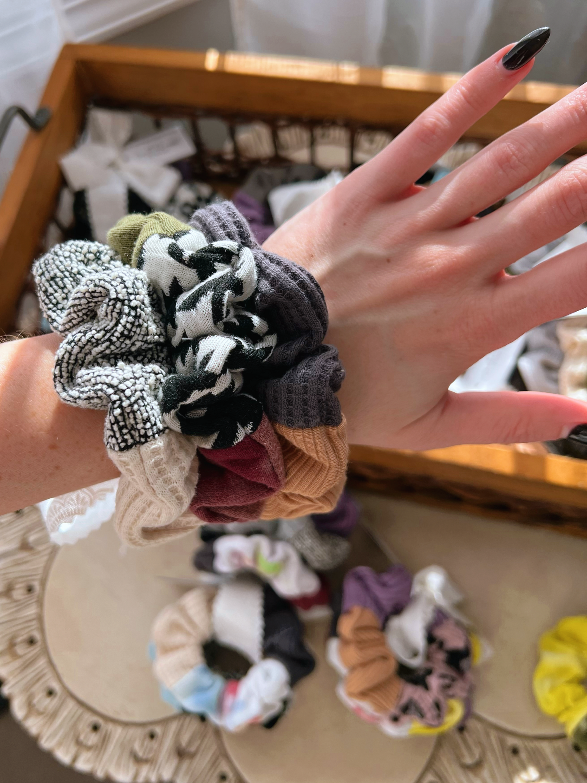These scrunchies each feature different colored, printed, textured fabrics patch-worked into one scrunchie. These are perfect for wearing in your hair or on your wrist. Each scrunchie and pack is different from the rest, your pack will be chosen by me for a fun little surprise.
