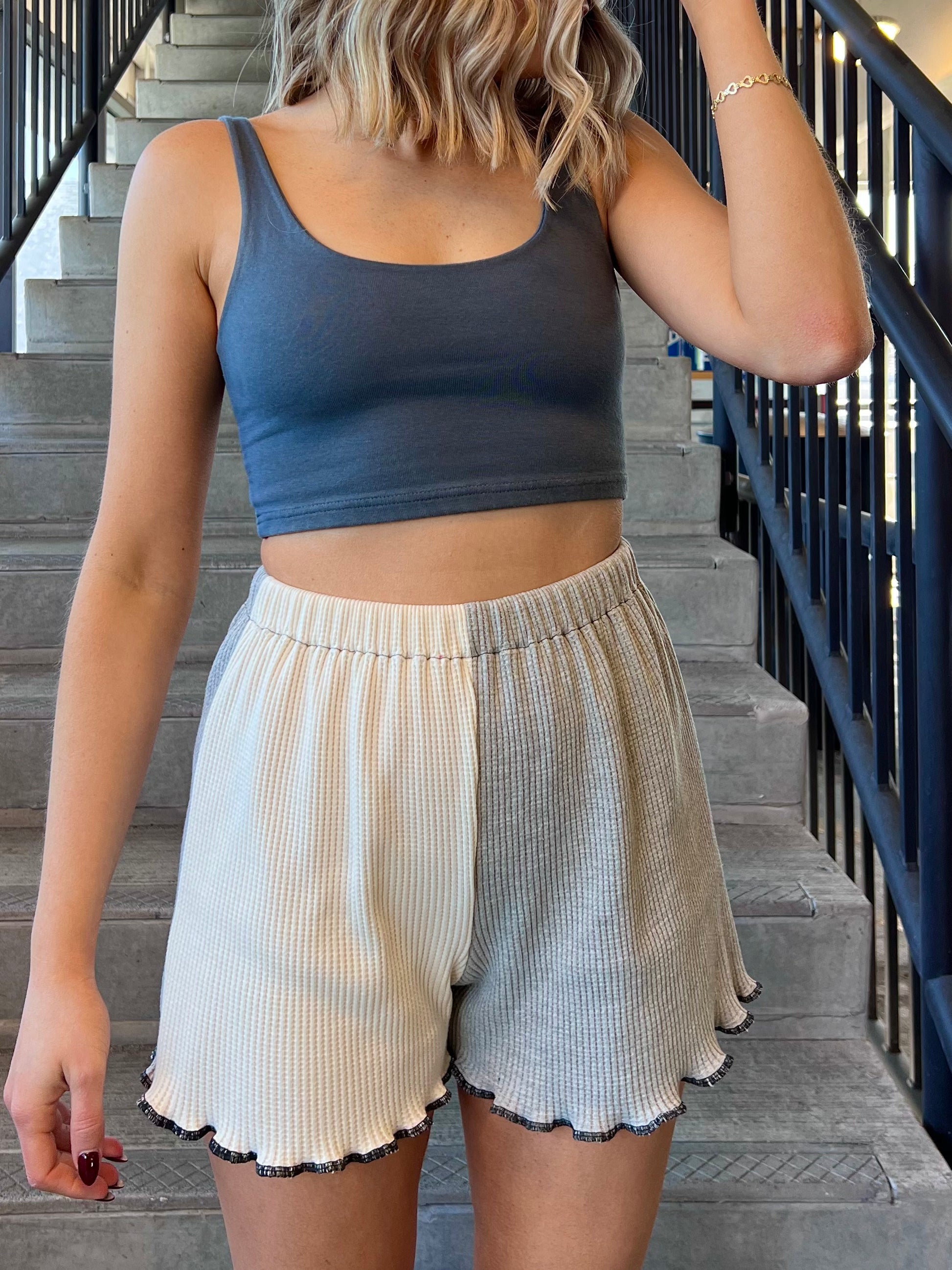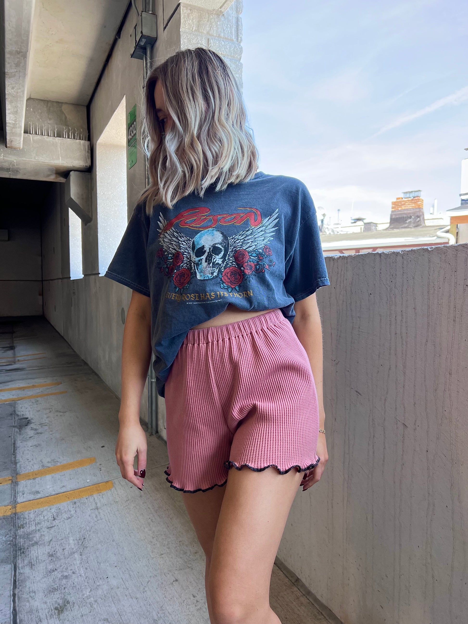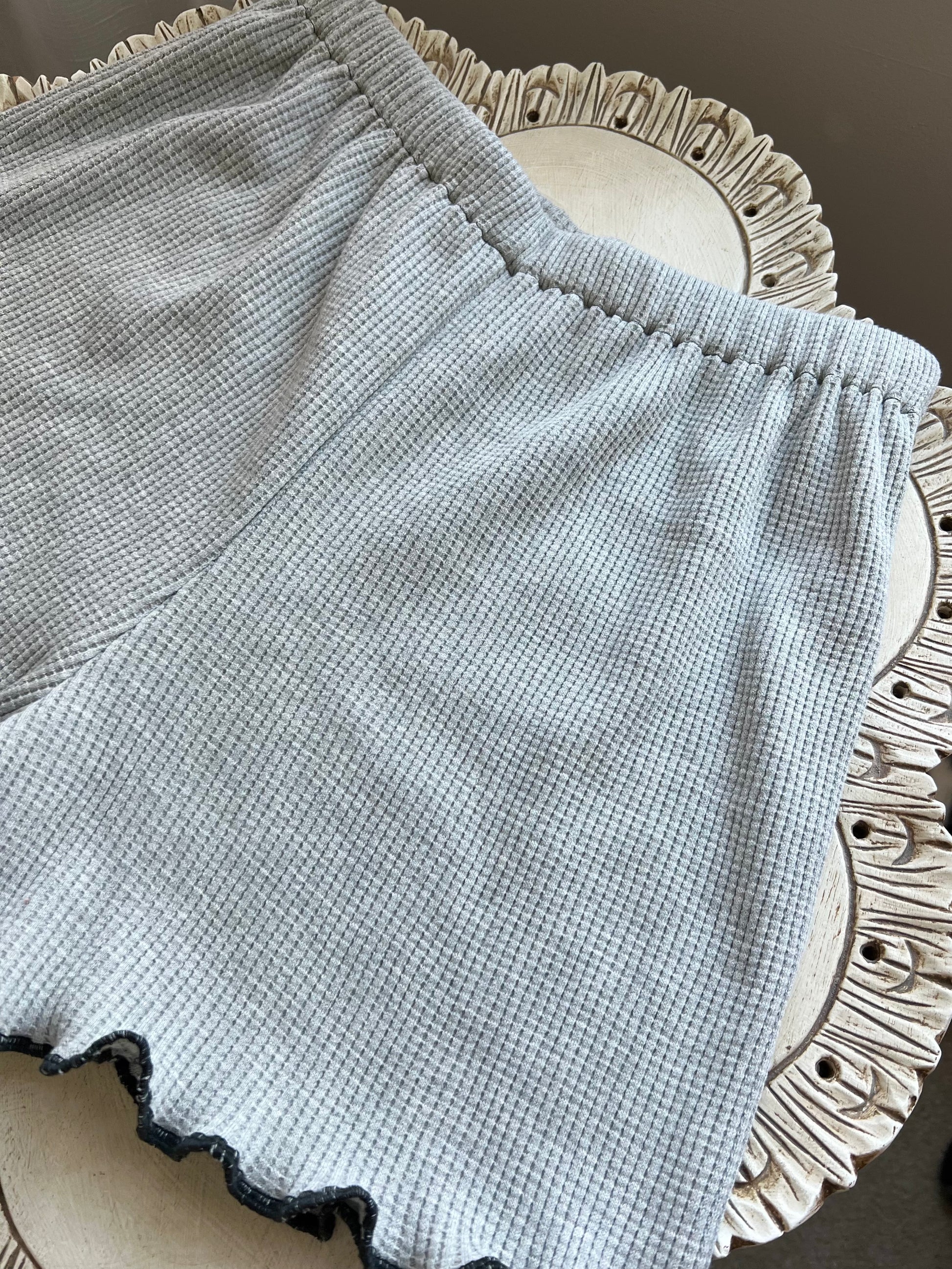These high-waisted shorts feature an elastic waistband, relaxed fit, and run true to size. This waffle knit material is breathable making them an extremely comfortable in the warmer weather. Each short is one of a kind wether it's all one color or a fun twist of mixing two colors in unique ways.