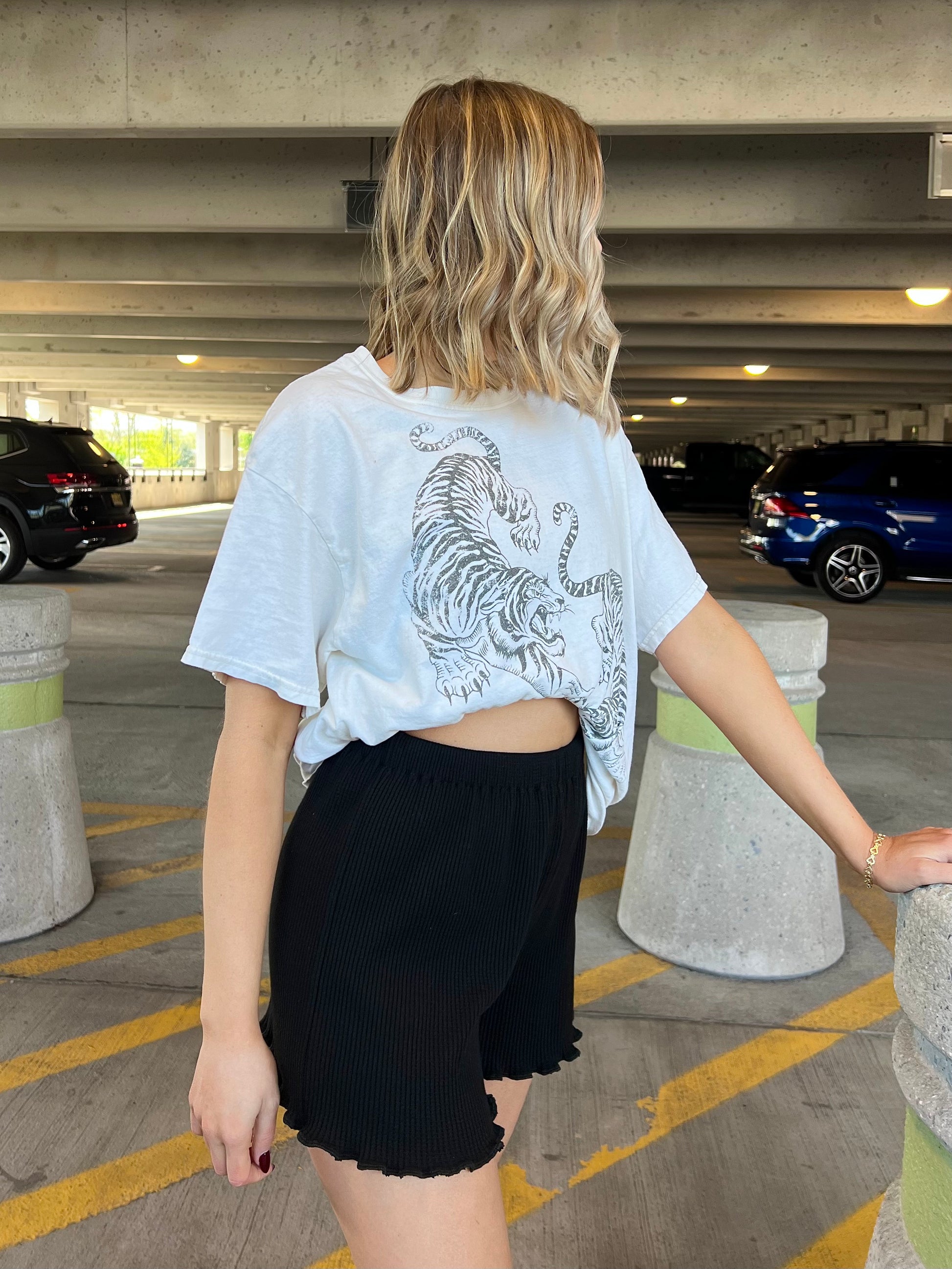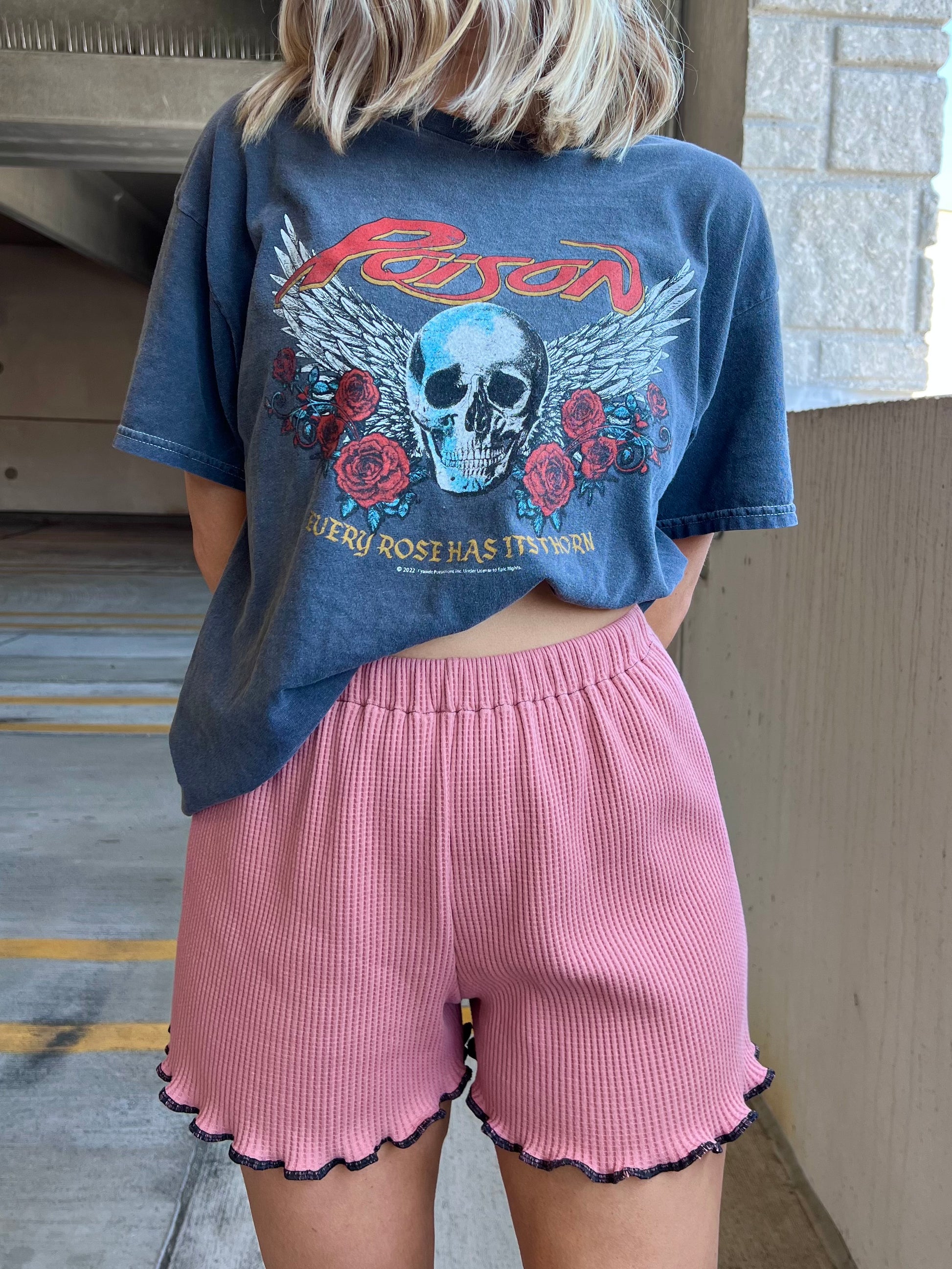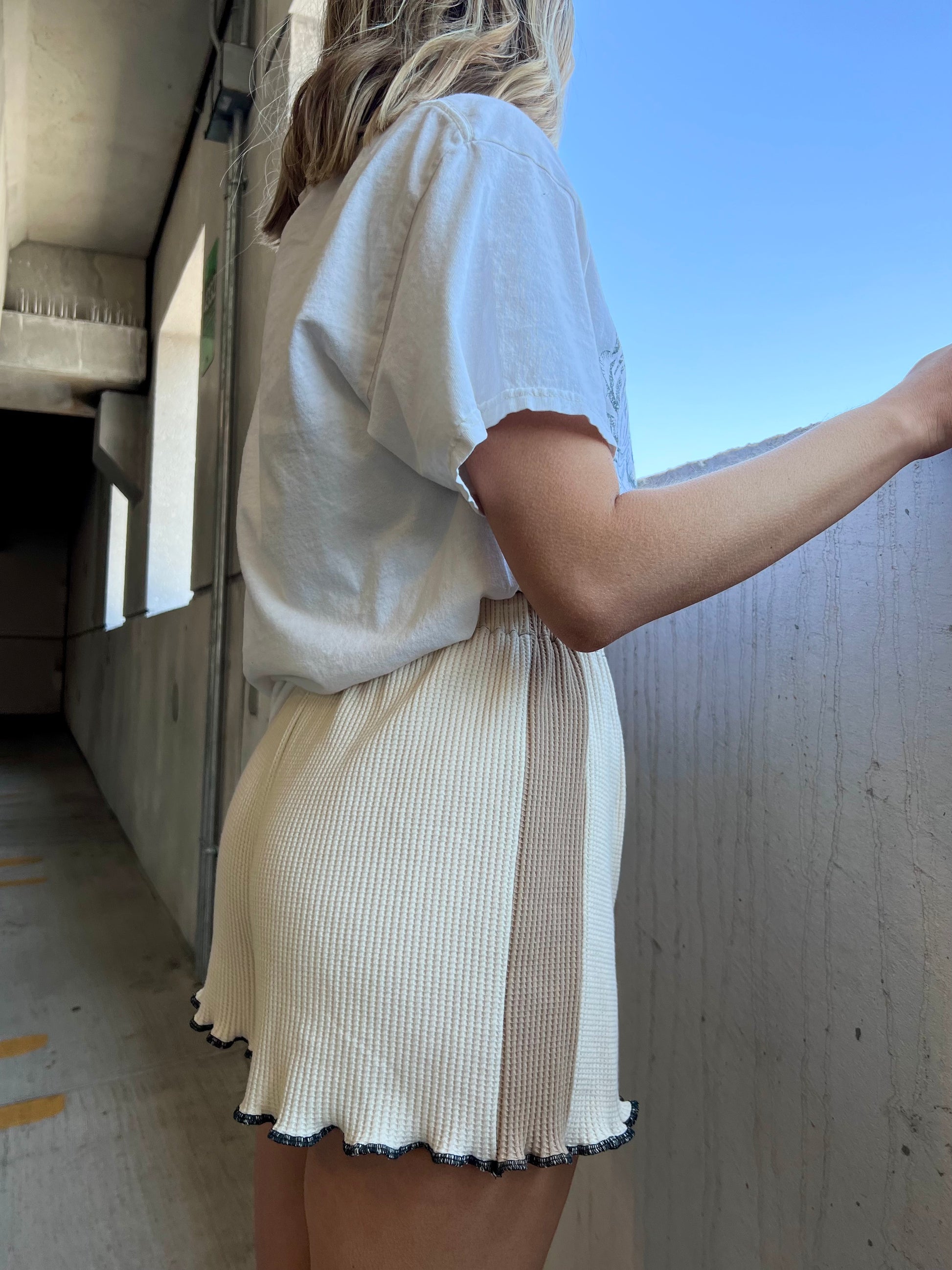 These high-waisted shorts feature an elastic waistband, relaxed fit, and run true to size. This waffle knit material is breathable making them an extremely comfortable in the warmer weather. Each short is one of a kind wether it's all one color or a fun twist of mixing two colors in unique ways.